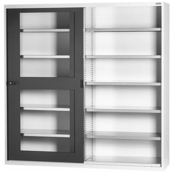 Armadio attrezzato 80×20G. Montaggio dei ripiani con passo da 25 mm. Ante scorrevoli rinforzate sul lato interno, richiudibili mediante maniglia bicomponente in Haptoprene® con serratura a cilindro. Arresto nelle posizioni finali delle ante scorrevoli (aperte/chiuse). Zoccolo di livellamento per armadi base con 8 piedini regolabili singolarmente in modo da compensare le irregolarità del pavimento. La maniglia si trova nella parte superiore dello sportello nell’armadio base, mentre è situata nella parte inferiore nel sopralzo.