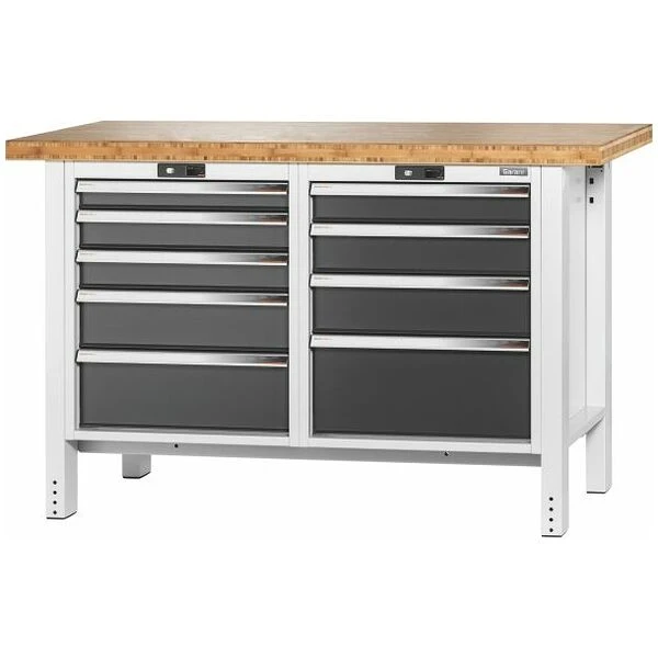 Banco da lavoro in stabile struttura in acciaio con traverse di fondo in tubo quadro. Corpo per cassetti a chiusura centralizzata mediante serratura a cilindro. Cassetti a estrazione totale, con portata di 75 kg. Piedini con tappi terminali in plastica a protezione del pavimento.