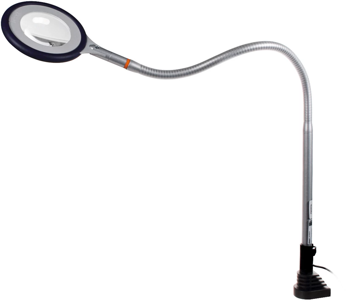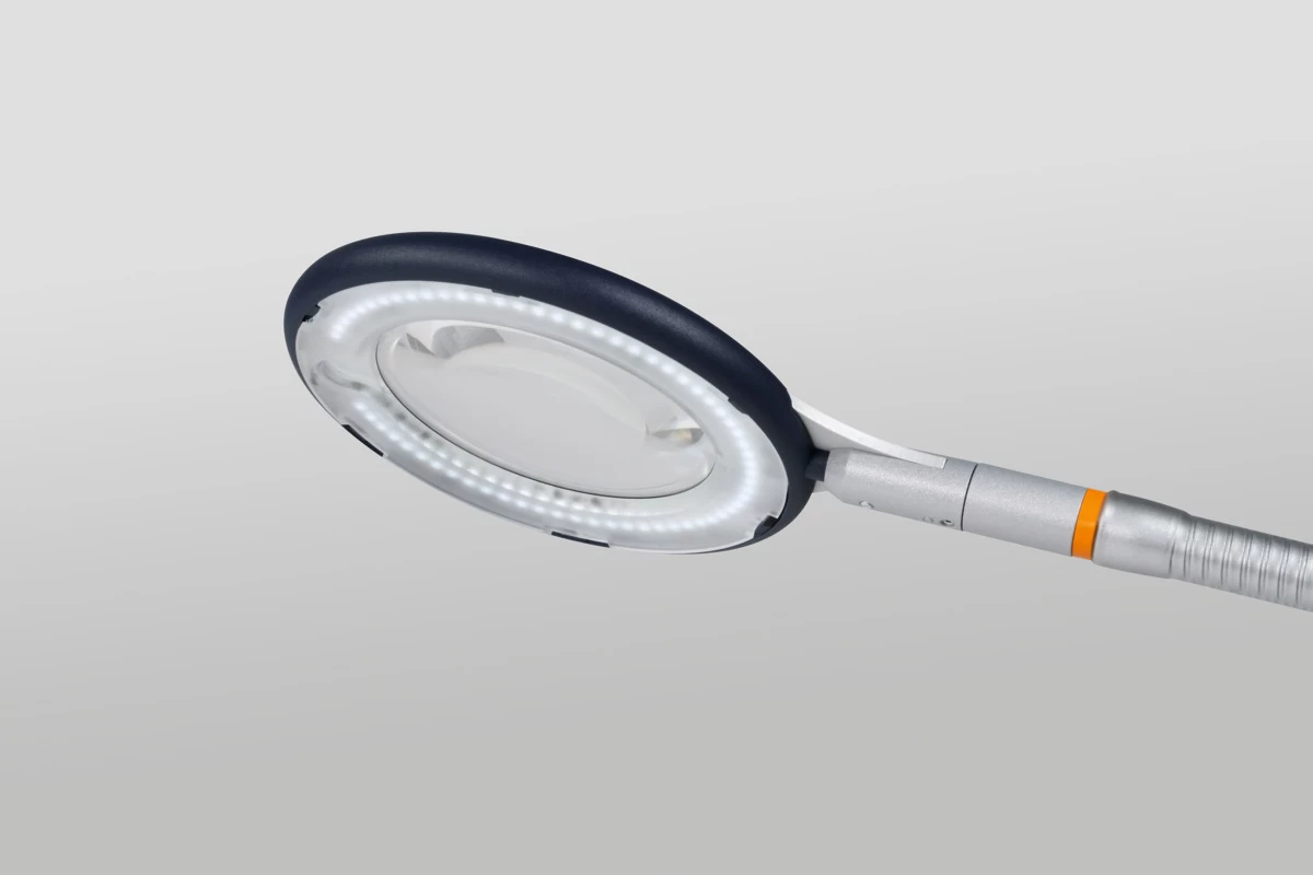 Lente di ingrandimento potente e anatomica. Testa della lente, tubo fisso e tubo flessibile in metallo robusto.
