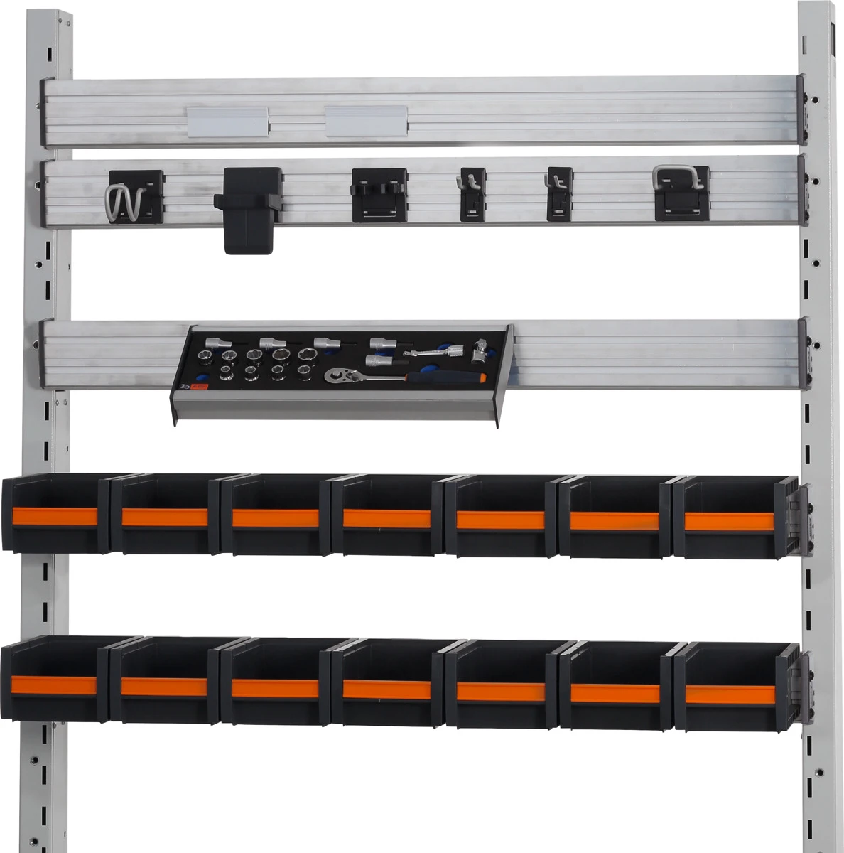 Guida multifunzionale in alluminio. Per l’utilizzo con ganci e supporti Easyfix, vaschette a bocca di lupo, supporti magnetici e shadow board nonché unità d’illuminazione n. art. 928630 (da Dim. 1000). Montaggio: da appendere alle piantane.