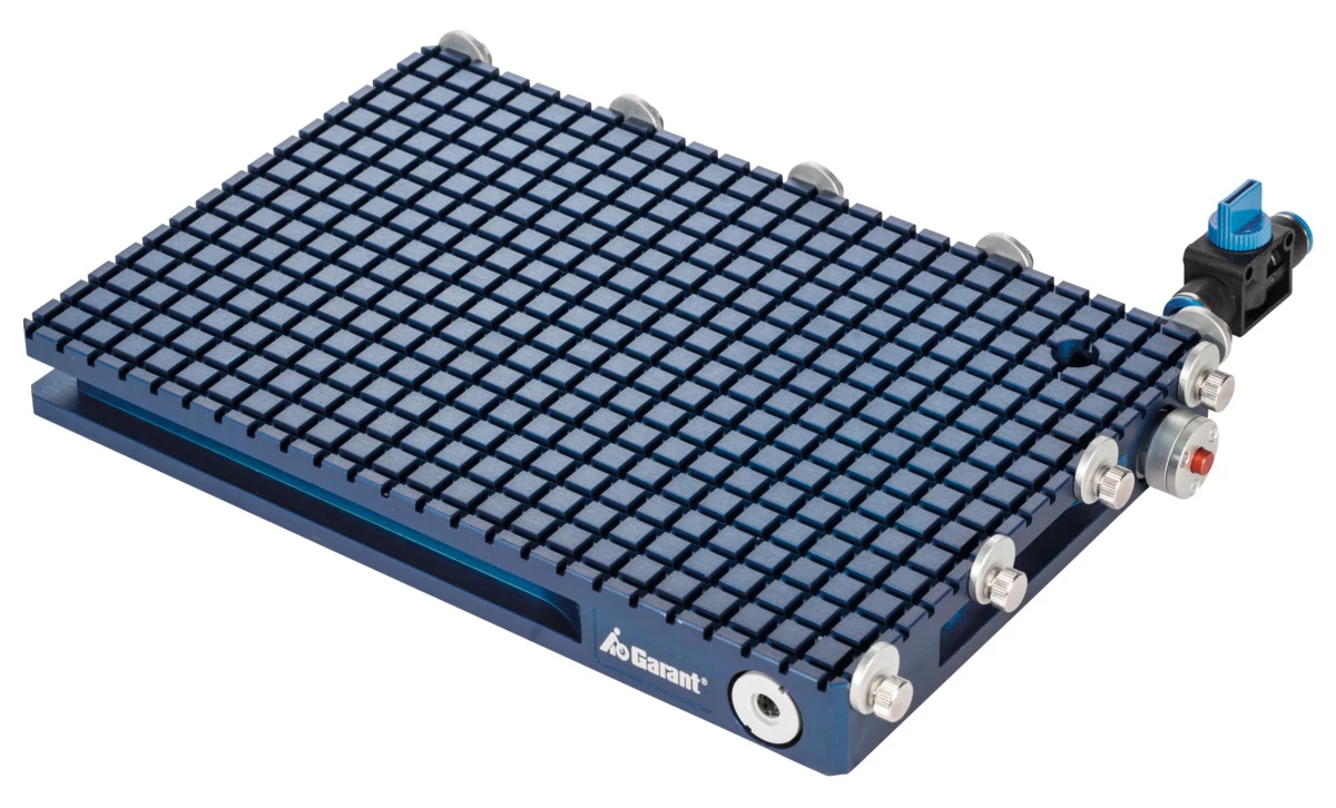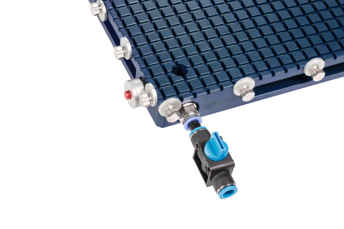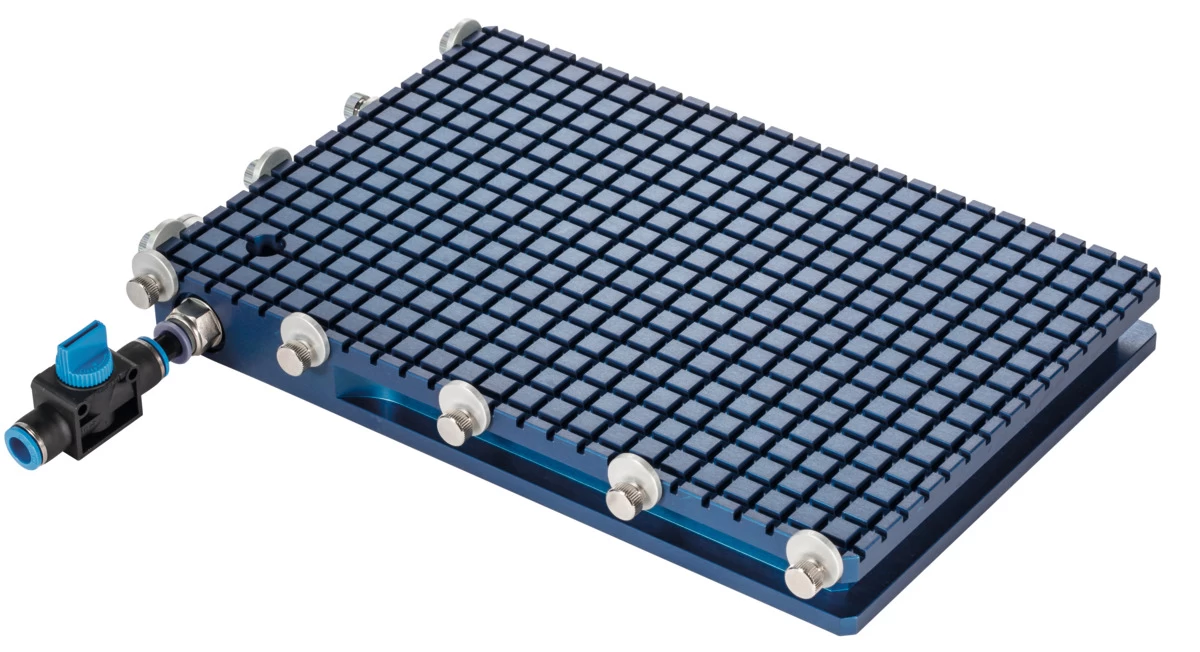 Alluminio, blu acciaio anodizzato. Pressione di esercizio 3,5 − 8 bar. Il vuoto finale è di circa 80 mbar (92% di vuoto). Silenziatore integrato per una rumorosità ridotta. Planarità ± 0,5 mm. Inclusi 2 fori ZeroClamp 12M10, interasse da 200 mm.