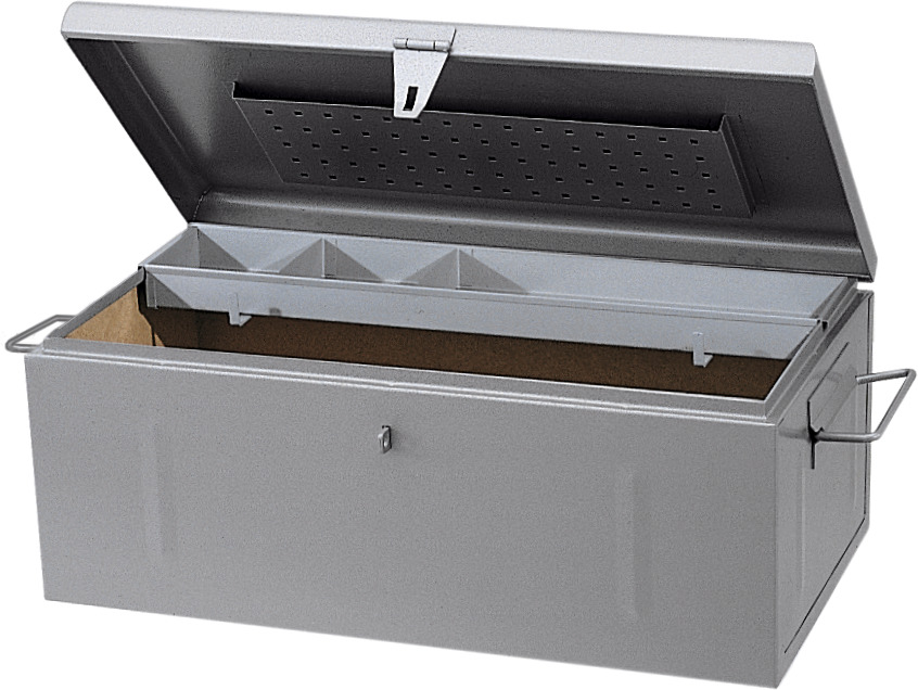 Lamiera spessa 1 mm con nervature di rinforzo. 2 maniglie e coperchio con fermo d’apertura. Chiusura con lucchetto (n. art. 085830 e segg.).